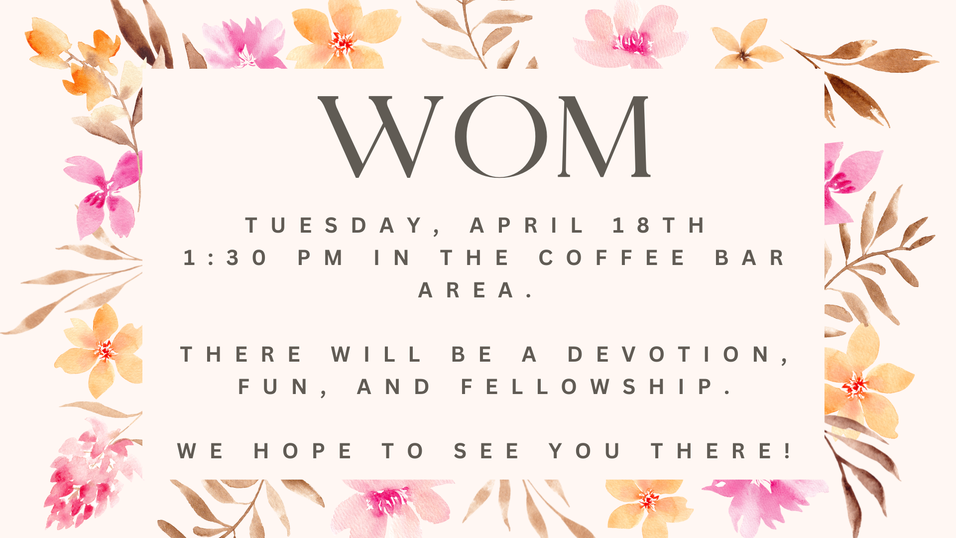 WOM Tuesday, April 18, 2023 1:30 PM 2:30 PM 13:30 14:30 First Baptist Church West Columbia 226 South Broad Street West Columbia, TX, 77486 United States (map) Google Calendar ICS