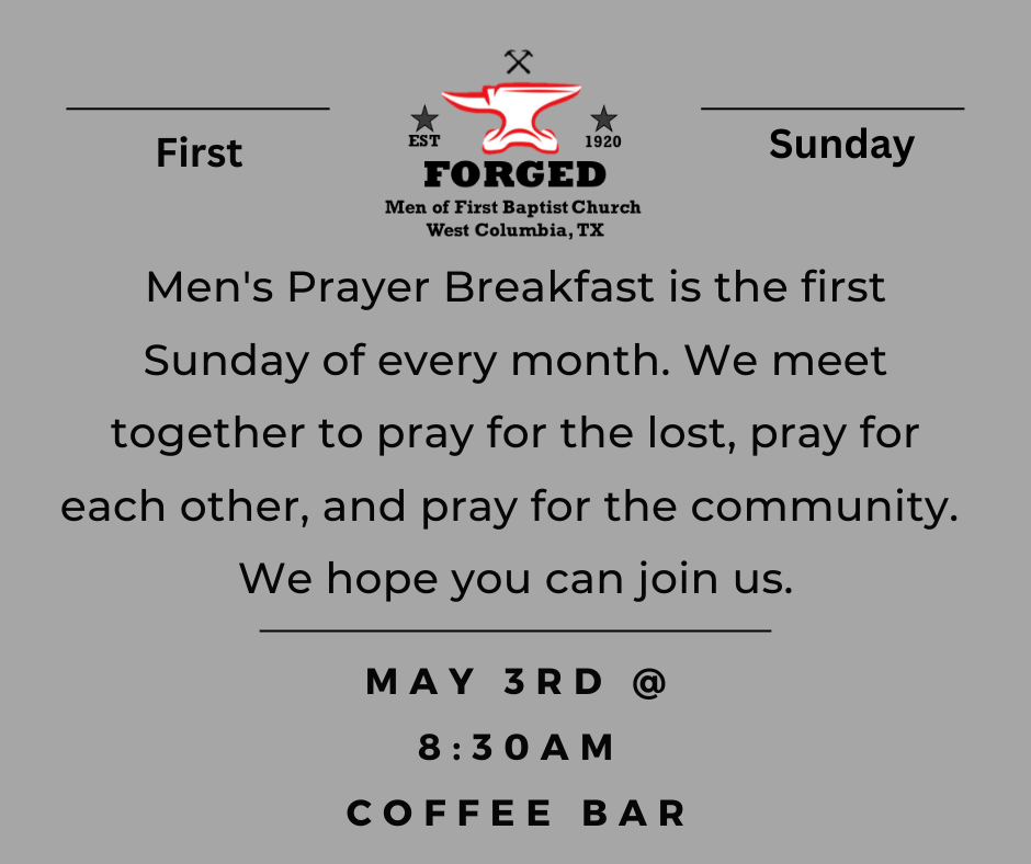 Men's Prayer Breakfast Sunday, May 3, 2026 8:30 AM 9:30 AM 08:30 09:30 First Baptist Church West Columbia 226 South Broad Street West Columbia, TX, 77486 United States (map) Google Calendar ICS