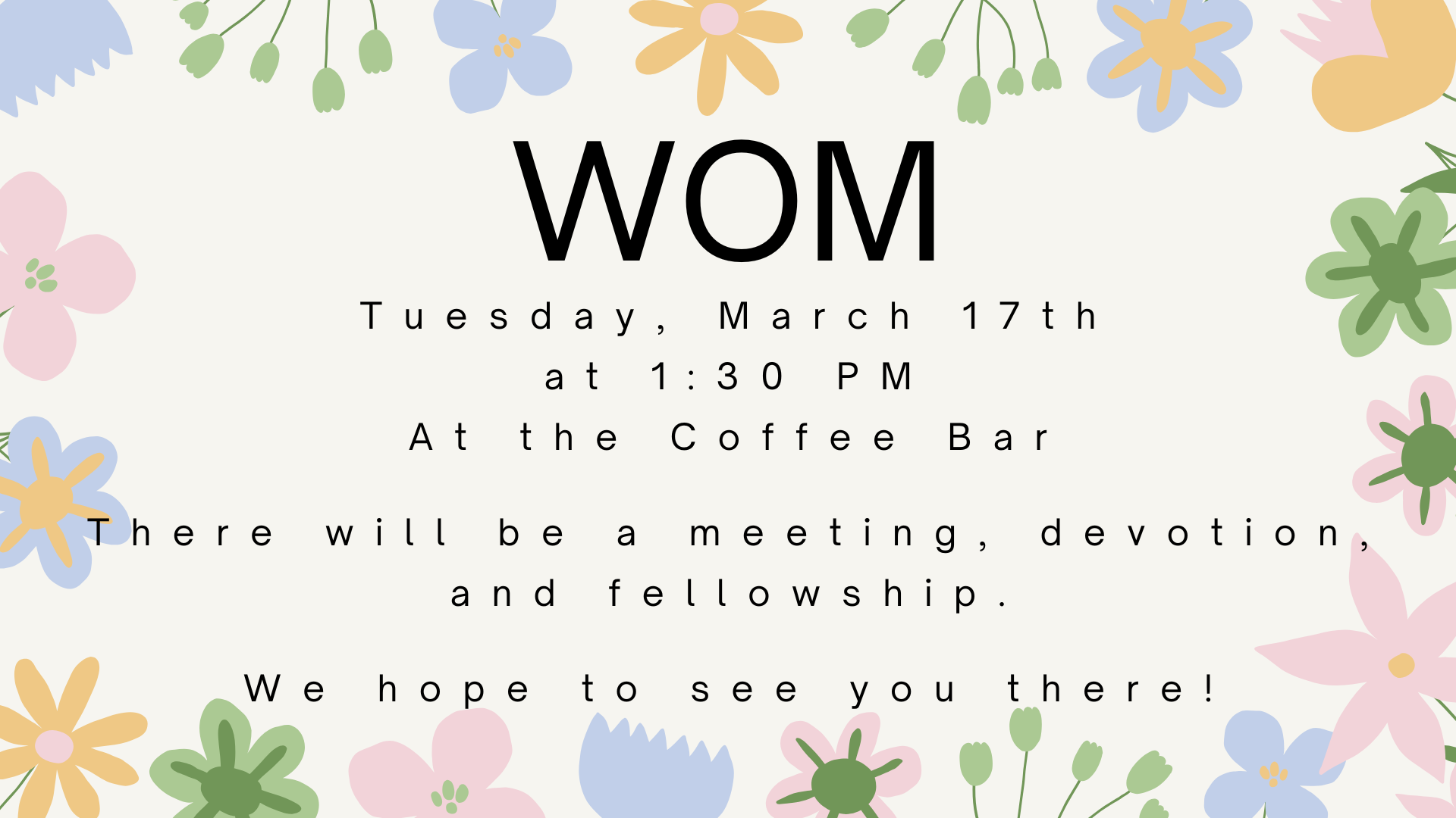 WOM Tuesday, March 17, 2026 1:30 PM 2:30 PM 13:30 14:30 First Baptist Church West Columbia 226 South Broad Street West Columbia, TX, 77486 United States (map) Google Calendar ICS